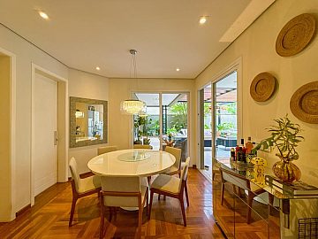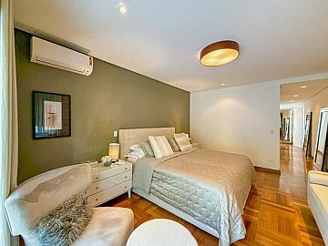 CONFORTO E COMODIDADE - MOBILIADA , REPLETA DE ARMÁRIOS, com4 suítes (todas com closets), Sala 02 ambientes, AR-CONDICIONADO em todos ambientes, AUTOMAÇÃO, ÁREA DE LAZER COMPLETA com piscina, lareira, adega, churrasqueira, amplo espaço gourmet, cinema, próxima a portaria e garagem com 03 vagas.